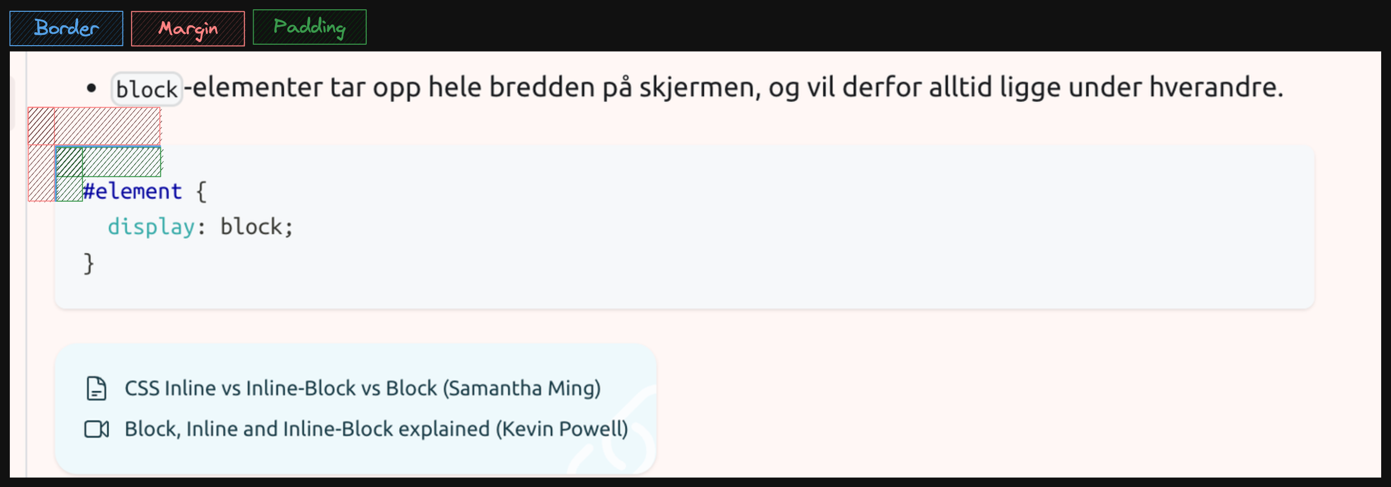 display-egenskapen bestemmer hvordan et element skal vises på skjermen.inline-elementer tar ikke opp hele bredden på skjermen, og kan derfor ligge ved siden av hverandre. Du kan ikke settewidthellerheightpåinline-elementer.block-elementer tar opp hele bredden på skjermen, og vil derfor alltid ligge under hverandre. Du kan settewidthogheightpåblock-elementer.margin-egenskapen lar deg legge til et mellomrom rundt et element.padding-egenskapen lar deg legge til et mellomrom inni et element.position-egenskapen lar deg plassere et element på et bestemt koordinat, relatert til skjermen eller et annet element.- Flexbox er en layout-modell som lar deg plassere elementer på en fleksibel og responsiv måte.